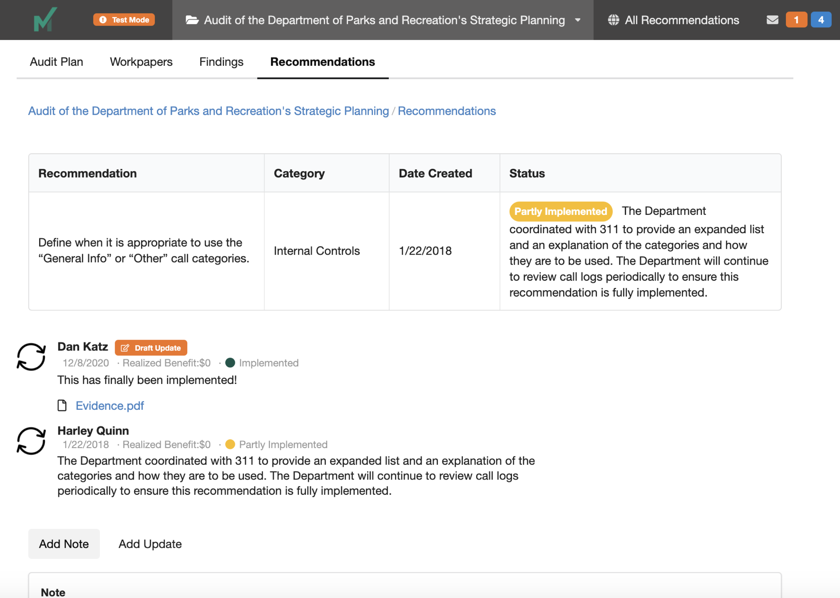 A recommendation portal built for auditors & auditees - easily submit updates, keep track of history with a built-in timeline, and analyze results with pre-configured dashboards and reports.